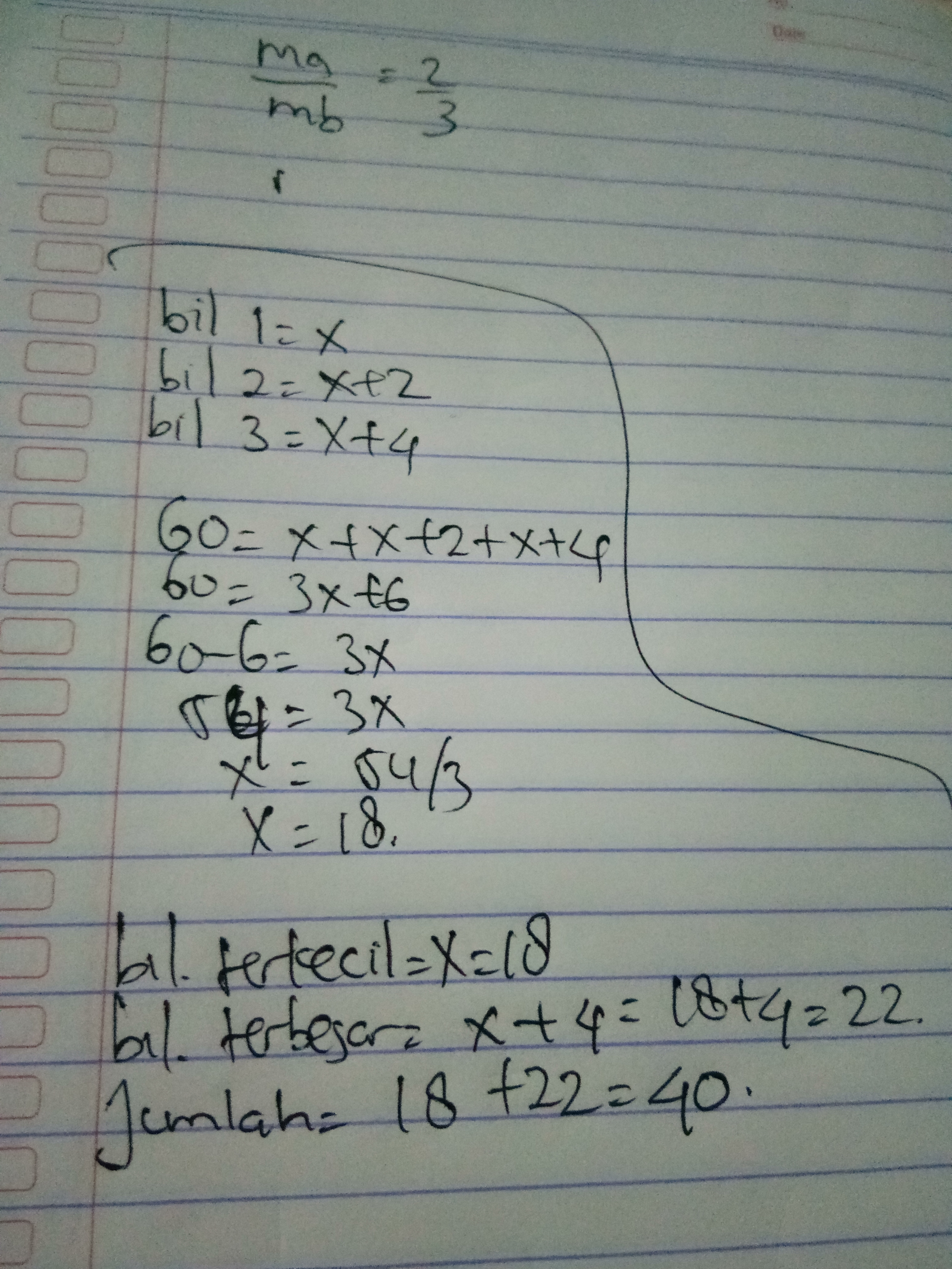 Tentukan tiga bilangan genap berurutan yang jumlahnya sama dengan 60. Dalam soal sebelumnya, saya sudah pernah membahas bagaimana cara cepat mencari ketiga bilangan yang diketahui jumlahnya. Temukan tiga bilangan genap berurutan yang jumlahnya 60. Jumlah tiga bilangan ganjil berurutan 3. (ingat pola bilangan genap : Jadi, tiga buah bilangan genap berurutan yang berjumlah 60 adalah 18, 20, dan 22. Contoh 1.5temukan tiga bilangan genap berurutan yang jumlahnya adalah 60.ayokita amatiuntuk memecahkan masalah pada contoh 1.5 kalian dapat menggunakan . Muxakara dan 507 orang menganggap jawaban . Play this game to review mathematics. Genap berurutan yang jumlahnya 60, 90, . Temukan tiga bilangan genap berurutan yang jumlahnya sama dengan 90. Melanjutkan menjadi 12, 18, 24, 30, 36, 42, 48, 54, 60. jadi, jumlah bilangan terbesar dan terkecil adalah :
